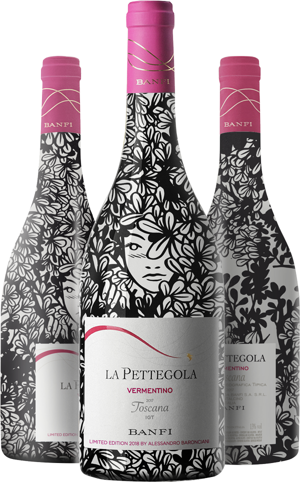 Le fronde s’intrecciano fino a creare una verde coltre impenetrabile. È ora di stappare una bottiglia de La Pettegola, prima che le ombre si allunghino nel crepuscolo della sera. Al suono del tappo che scivola dal collo della bottiglia, i rami della siepe hanno un sussulto. Il viso candido di una ragazza compare tra le foglie. Il suo sguardo malizioso cerca qualcosa, qualcuno. Nessuno lo sa. Verso il vino nel calice e le note di frutta bianca sono la promessa del suo gusto fresco e pieno. A ogni sorso la ragazza acquista sempre più fascino e carisma. Il bicchiere si vuota e, così come era apparsa, La Pettegola svanisce, lasciando solo il ricordo persistente di un’emozione difficile da dimenticare.
